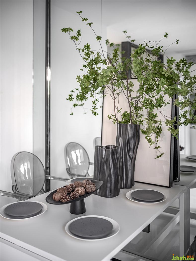 富有藝術(shù)氣息的透明山水茶幾,水晶質(zhì)感的透明座椅,樣板房設(shè)計(jì)自然光經(jīng)過折射的加工變得更為柔和,中和了侘寂風(fēng)中自帶的清冷孤傲。