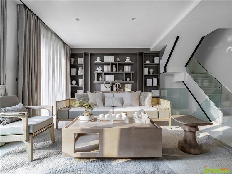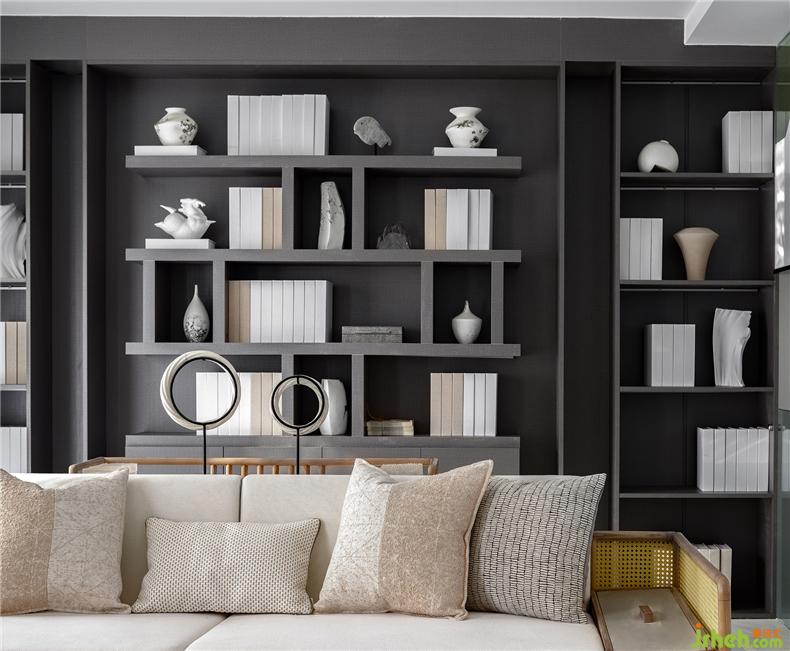 樣板房設(shè)計(jì)客廳留出一整面墻壁,將博古架進(jìn)行現(xiàn)代形式的改良,陳列出主人的文化素養(yǎng)和高雅志趣。恣意生長(zhǎng)的綠植、黑色線條與淺木色家具形成對(duì)比,流露藝術(shù)的極簡(jiǎn)之美、空間的動(dòng)靜之美