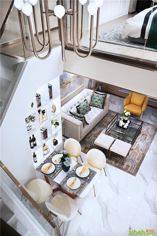 樓梯底下是酒柜,白色噴漆,內(nèi)藏?zé)魺簦蛷d上方是吊燈,材質(zhì)是玫瑰金不銹鋼,設(shè)計師希望材質(zhì)是統(tǒng)一的,簡單的。