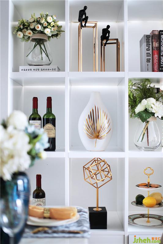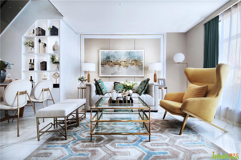 設計師在軟裝飾品的擺放也很考究,飾品的擺放構(gòu)圖三角形,避免呆板,色彩上按6:3:1原則。