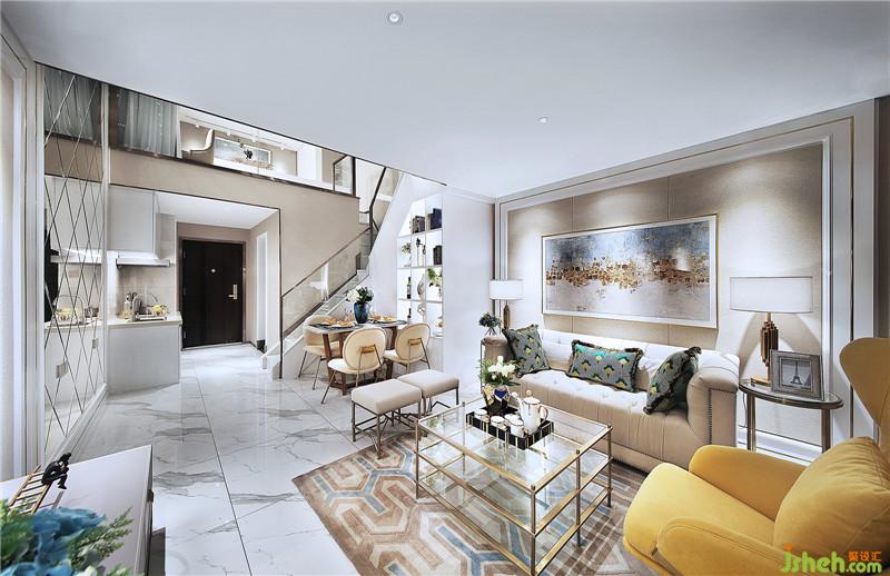 This case adopts modern simple European style, furniture is younger, sofa material is fabric, light color, sofa foot is rose gold stainless steel, tea table is tempered glass + Rose Gold Stainless steel, left is two feet, right is a high-back chair, comfort is not noble