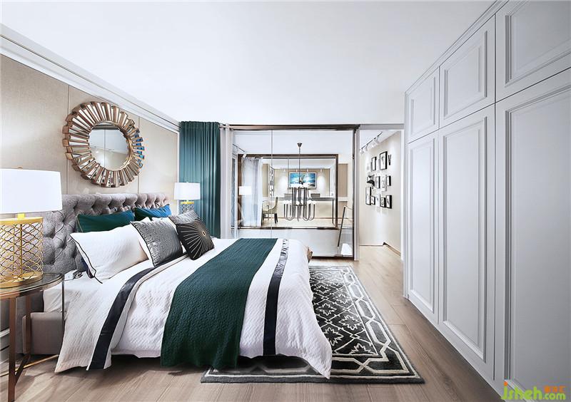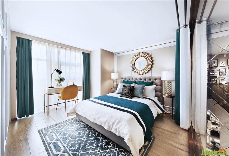 主臥是靠南面,采光最好,靠窗位是寫字臺,椅子用了檸檬黃跳色,窗簾用了墨綠色和床品用色呼應,這樣空間不會太呆板,床背景的掛飾和腰枕紋理顏色呼應。