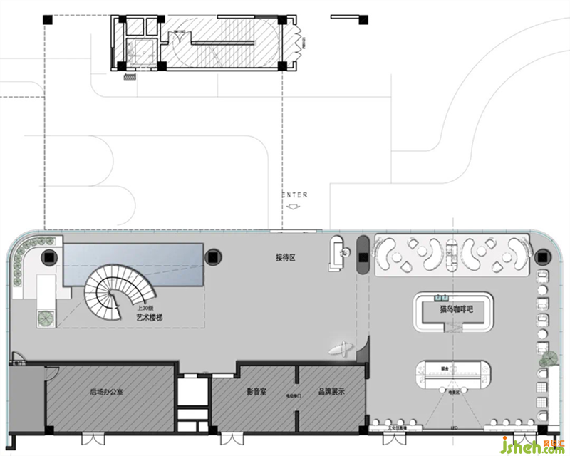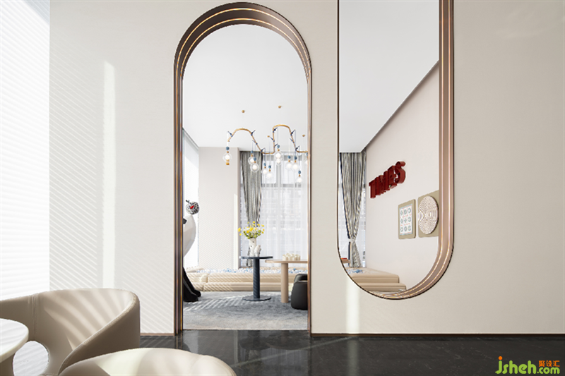 如日月般的藝術(shù)品被設(shè)計(jì)成空間意識(shí)的錨點(diǎn),在不知不覺中牽引你游向彼岸。形如月般的灰色底盤,翻折出水紋,映射波瀾晃動(dòng)間的點(diǎn)點(diǎn)光斑。一種東方哲學(xué)意境,在當(dāng)代設(shè)計(jì)語義下卻絲毫未見魅力,相互生出一種創(chuàng)造性的美的平衡。