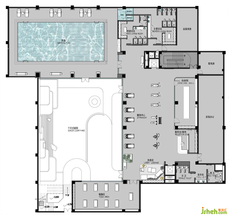 地下一層融合游泳健身、瑜伽冥想、魅力擊劍的社區(qū)生活主題,設(shè)計(jì)師充分考慮了實(shí)用性、功能性和開放性,將充足的陽光迎入室內(nèi),讓下沉式庭院與地下一層核心區(qū)域接洽,還寬敞、明亮于運(yùn)動(dòng)場域,打造舒適休閑的健康人生。