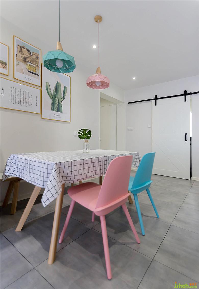 粉、藍色北歐餐椅,與吊燈顏色相響應(yīng),自然清新的裝飾畫,更顯小清新氣質(zhì)。