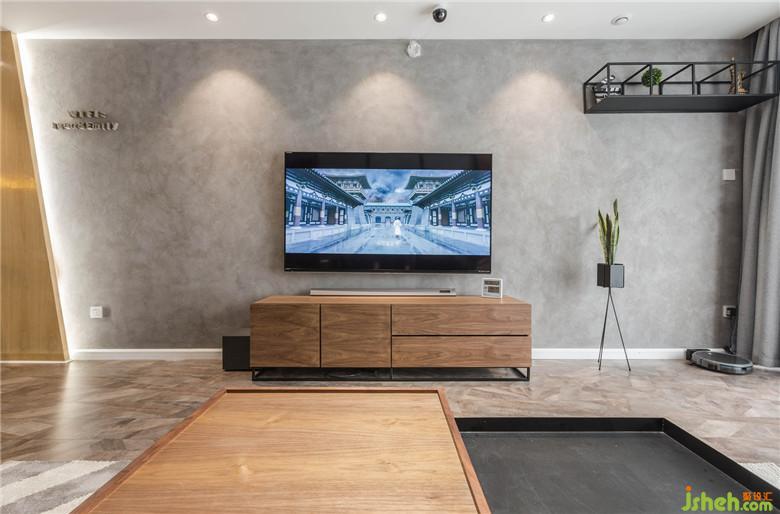 電視背景是刷的水泥肌理漆,墻上的黑色鐵藝置物架和落地花器,在灰色的背景的襯托下,時(shí)尚個(gè)性。