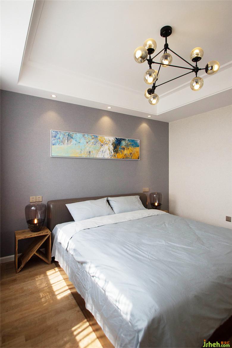 主臥室內(nèi)設計師使用配色更加清淡,營造舒適的休息空間。