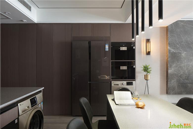 室內(nèi)設(shè)計(jì)師利用原餐廳位置做了一組儲(chǔ)物柜,同時(shí)把冰箱、烘干機(jī)、微波爐、烤箱等電器都嵌入進(jìn)去。這樣空間既不顯亂又得到了充分利用。