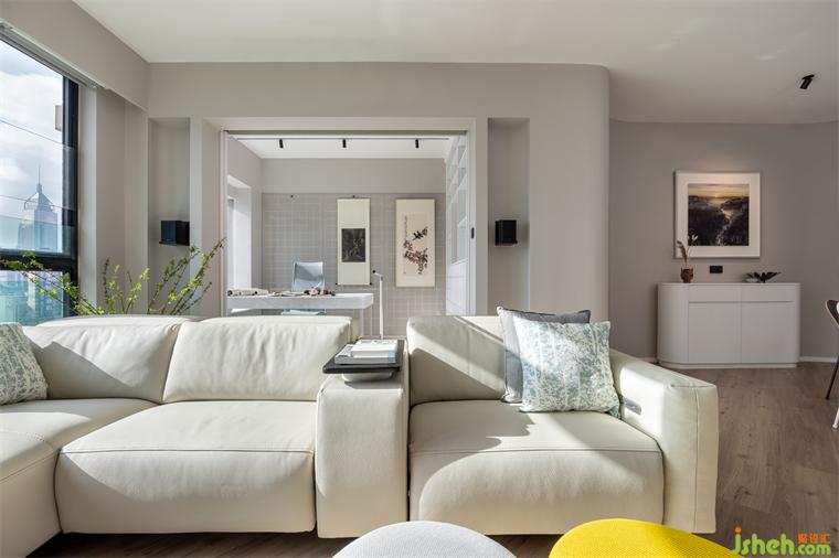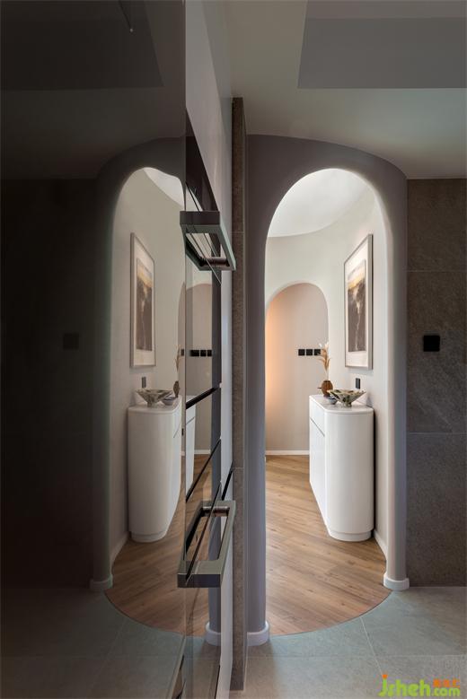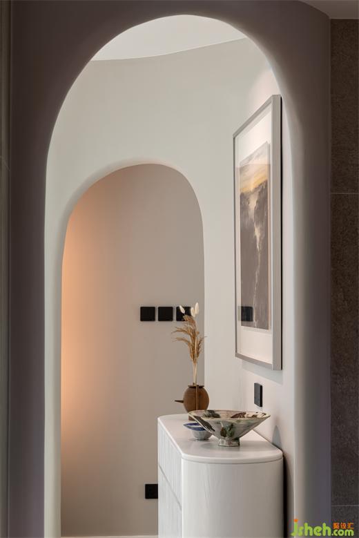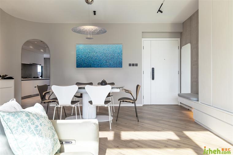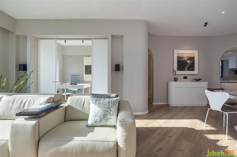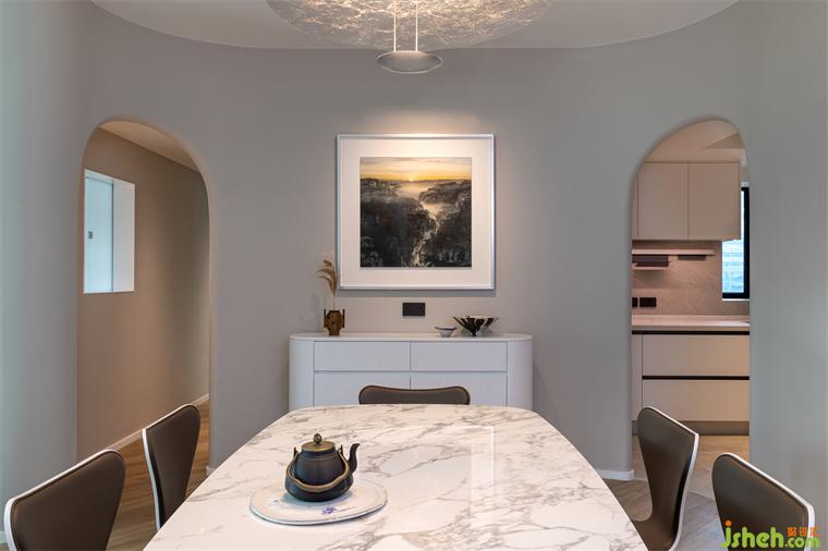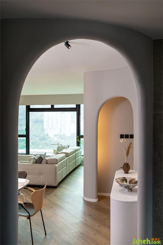 廖奕權(quán)唯一移動的墻壁是將客用浴室與餐廳/客廳分隔的那堵墻;他將其推后以為更頻繁使用的公共區(qū)域提供額外的空間。重新定位墻壁意味著餐廳現(xiàn)在有了一些尷尬的角落,廖奕權(quán)認(rèn)為這些角落看起來不太舒服。他通過將它們變成優(yōu)雅的曲線來隱藏這些不雅的角落,并建造了兩個(gè)拱形入口,公寓設(shè)計(jì)分別通往走廊和廚房,而沒有門框。廖奕權(quán)通過使用帶有圓角的家具以及橢圓形餐桌上方的戲劇性圓形燈具來進(jìn)一步吸引人們對墻壁柔和形狀的注意。