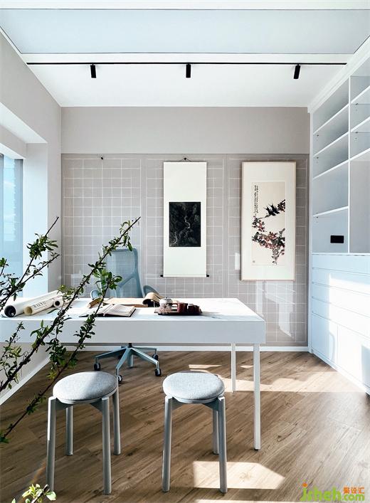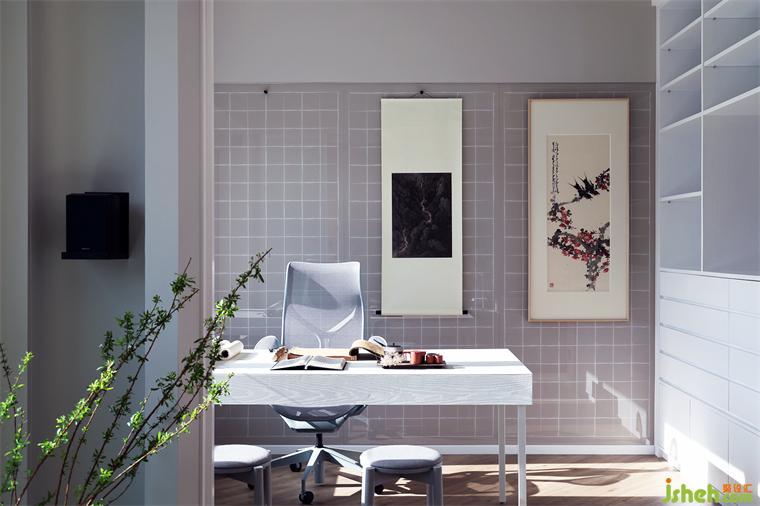 背景墻用上了精心設計過的定制網(wǎng)格圖案面板比例方格玻璃便于男戶主可以構(gòu)思畫作構(gòu)圖,并用磁性玻璃覆蓋,讓男戶主可以輕松“掛”起初稿藝術(shù)品,調(diào)整尺寸和框架。墻上掛上男戶主最珍貴的藝術(shù)收藏“藍瑛”的作品。