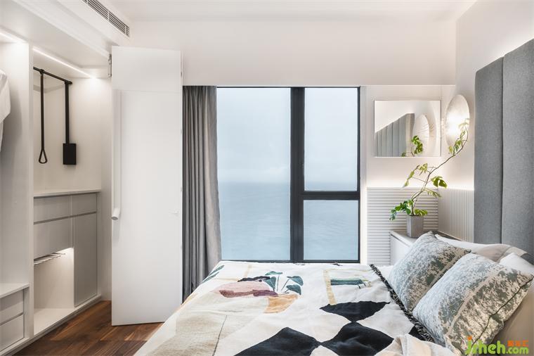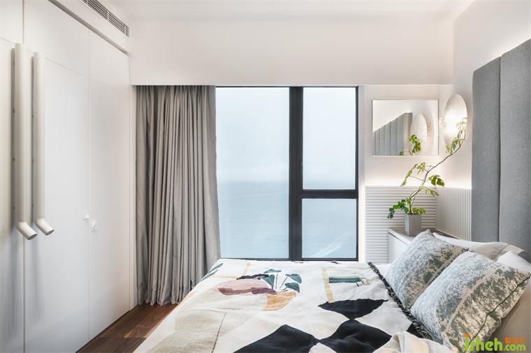 1.床頭的灰色捫布及軟裝元素,豐富了簡約的純白空間。 床頭柜刻意加高,方便戶主取放書籍讀物。