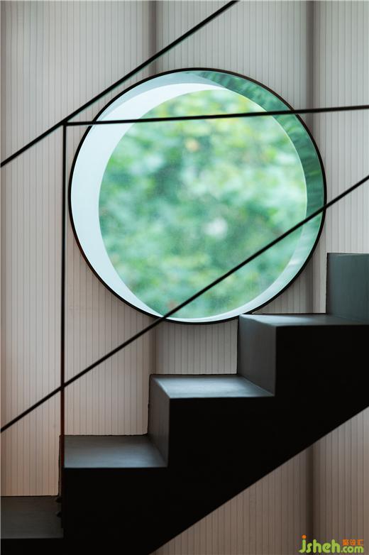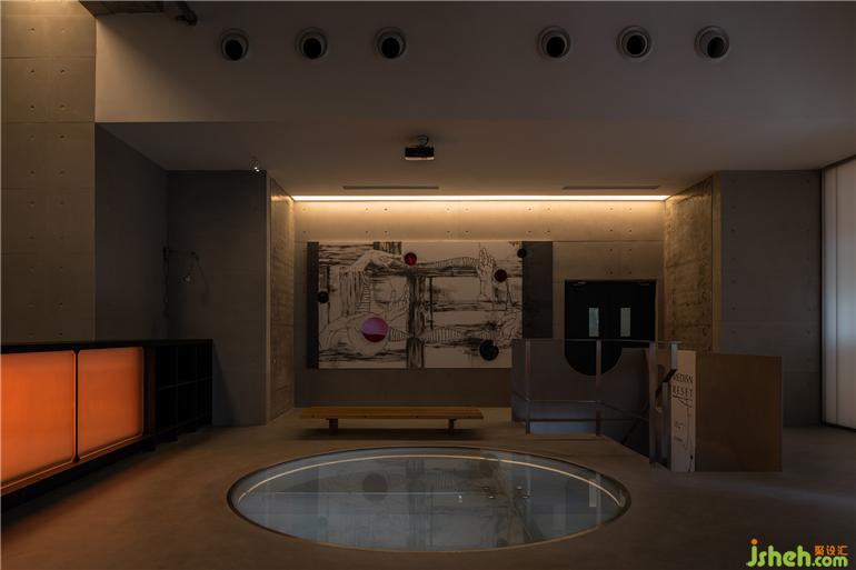 藝術(shù)的魅力在于自我的剝離與疼痛的嵌入。這個(gè)內(nèi)嵌于水泥梁柱之間的巨型玻璃圓洞,既充當(dāng)了空間視覺在上下關(guān)系中回來穿透的路徑,也成為了作用于酒精與刺青之間剝離與疼痛的象征。