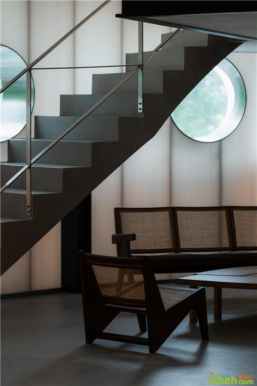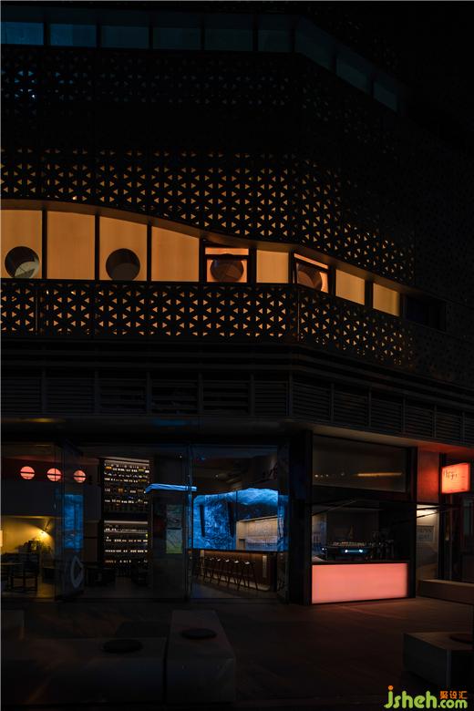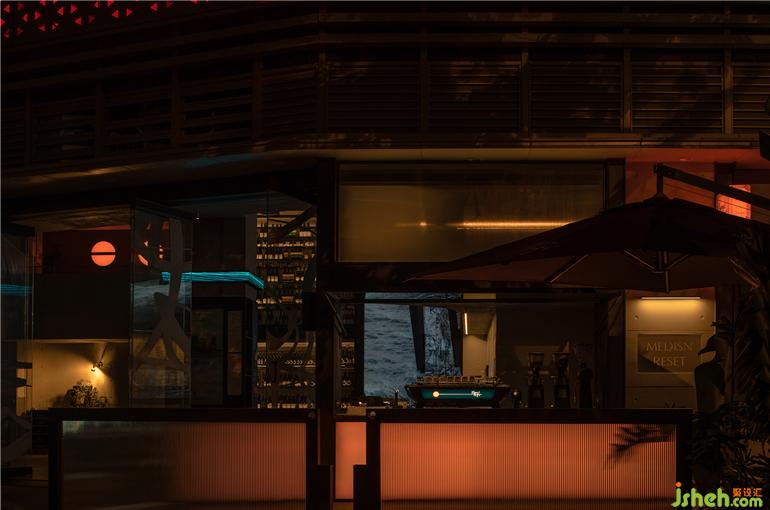 干凈、克制的灰色水泥墻面,一改白日的沉默氣質(zhì),成為空間視覺藝術(shù)無處不在的載體,為藝術(shù)氛圍的表現(xiàn)發(fā)揮著空間整體性與適應(yīng)性的作用,充當(dāng)了畫布與容器的雙重功能。