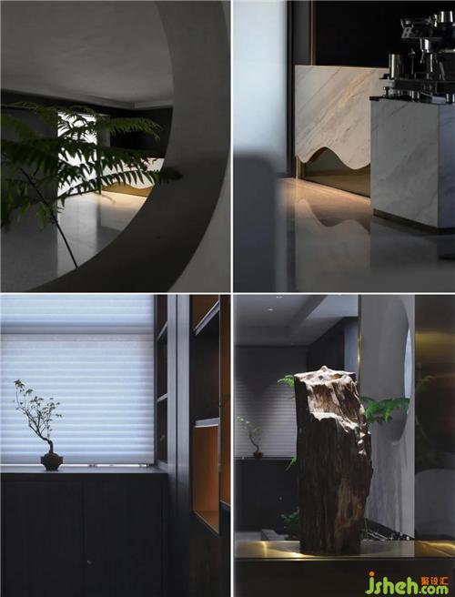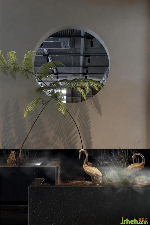 接待區(qū)隱秘而安靜,黑色木飾面與光影產(chǎn)生平和的表情。室內(nèi)造一水景,潺潺 水聲打破靜謐的空間:“鶴鳴九皋,聲聞于天”,營造空間的詩意、俊雅。