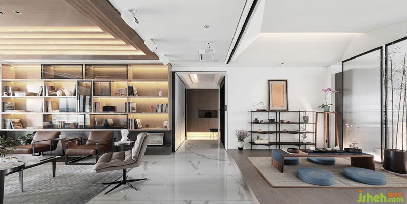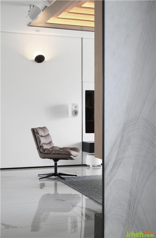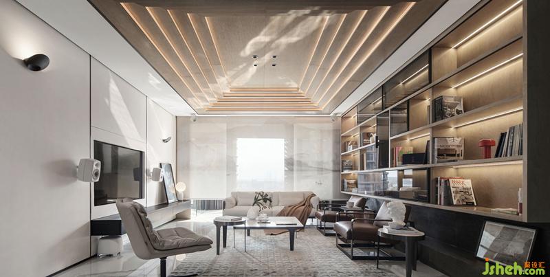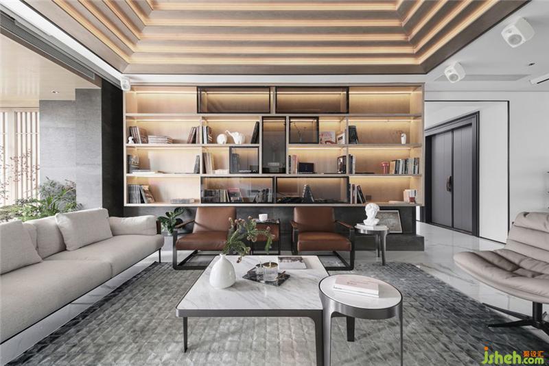 整面書架結(jié)構(gòu)作為客廳的中堂,當中呈現(xiàn)出“正”字背景。這是父親留下的做人做事立于“正”字根本,“凜然正氣,天地合一”,取其意、取其境、用其韻。“正”字前方有兩張現(xiàn)代單人椅為正坐南京裝修設計,家訓時刻提醒著主人夫婦。頂面結(jié)構(gòu)依然保持對稱,層疊出五個層次,象征五行之數(shù):“循環(huán)相生、剛?cè)岵?。設計另比作是“年輪”,有成長的寓意。一個居所要有生命體系,就好比樹木一樣,在自然中應生機盎然,因此所用的材質(zhì)是胡桃木,自然的紋理充滿著生命的有機力量。