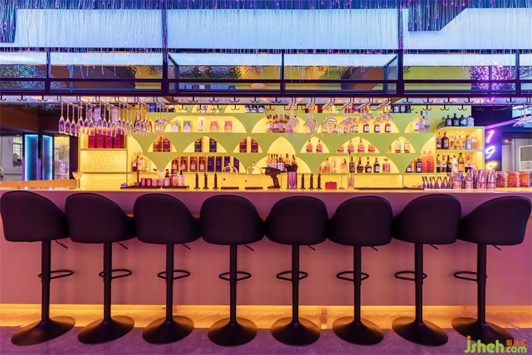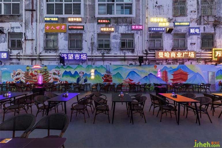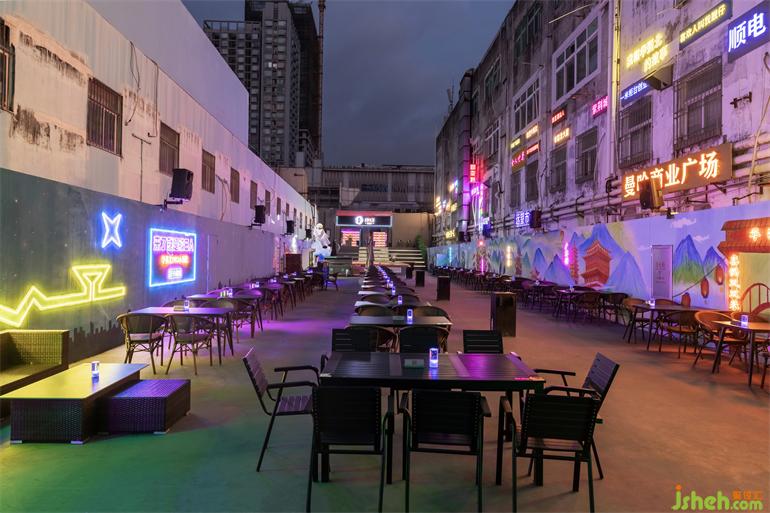 酒館的室內(nèi)環(huán)境現(xiàn)代而充滿歡樂,在深圳這個擁有著年輕血液的城市中開辟出一個。棋牌室設(shè)計師將其定義為一個不斷變化的環(huán)境,從而可以滿足一天內(nèi)人們晚上的不同需求,從小吃到宵夜和酒飲,為顧客們提供全天候的飲食,更為他們創(chuàng)造出一個全天候的共享式體驗空間和活動空間。這座小酒館充分利用了華強北的步行街,設(shè)置了一系列讓人想一探究竟的室外座椅。值得一提的是室外的霓虹燈,這個霓虹燈在整個酒館設(shè)計中建立了一個反復(fù)出現(xiàn)的主題:即將室外元素帶進(jìn)室內(nèi),反之亦然。使夢人回華強北1983那個基工建設(shè)最火熱的年代