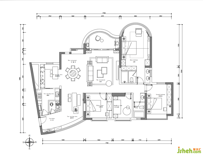 廚房墻體使用大理石花紋,如悠悠水墨般盡顯古韻,圓形餐桌搭配中式吊燈,古典寧靜的用餐區(qū)溫馨治愈。開放式廚房的設計,家裝設計流暢的動線符合人體運動學原理,更為便捷滿足。
