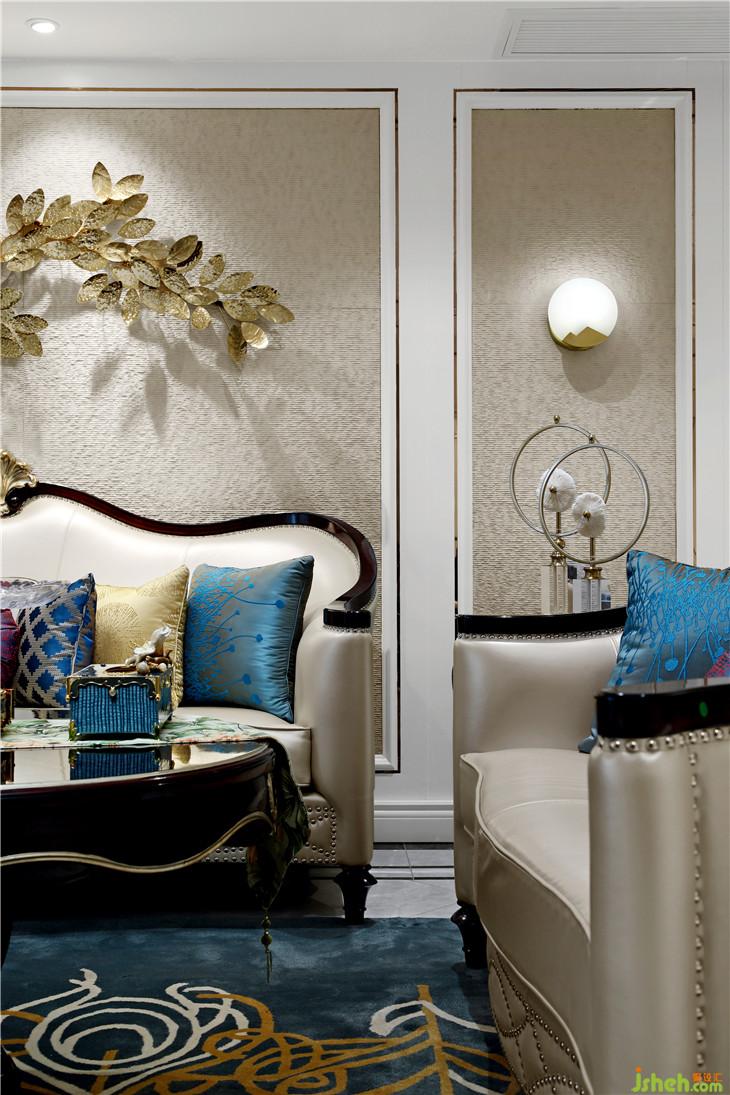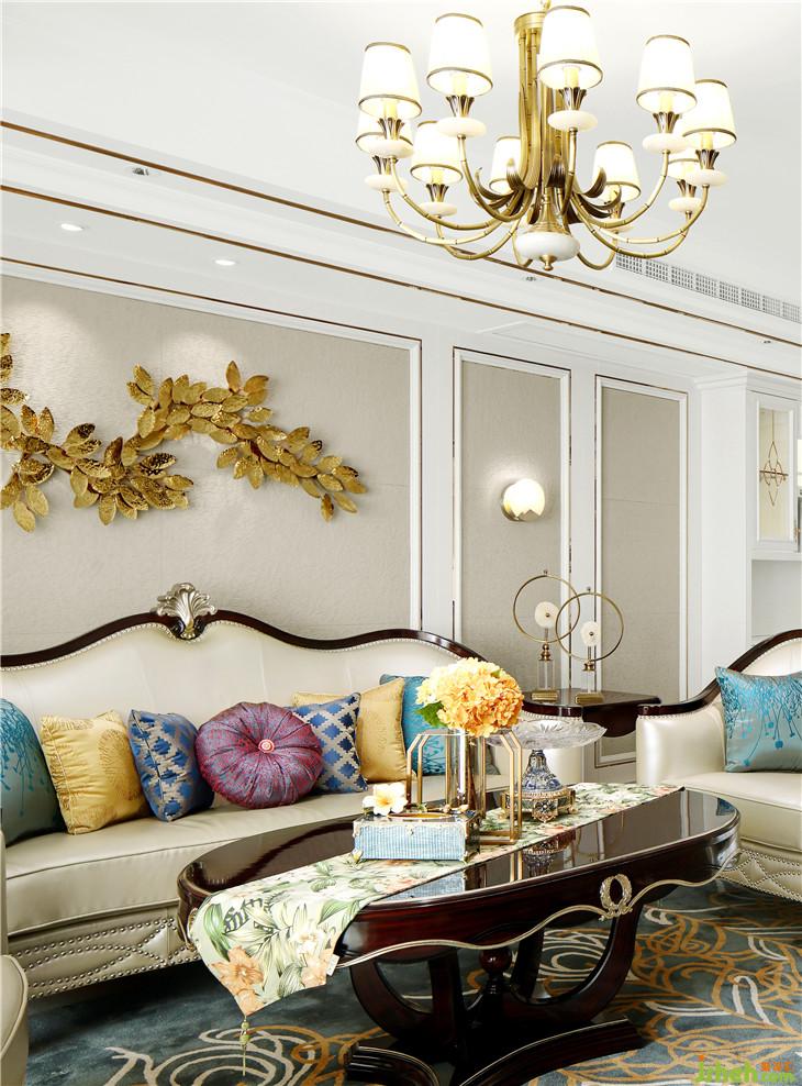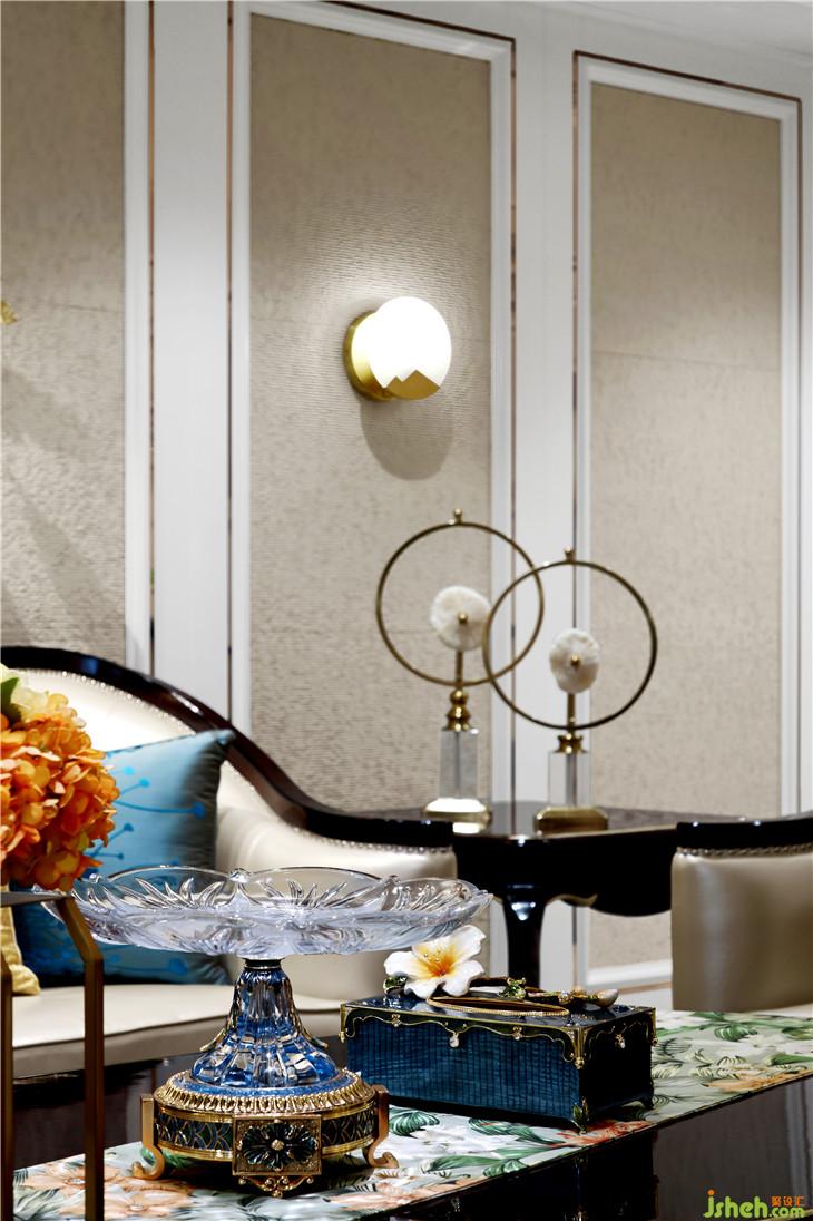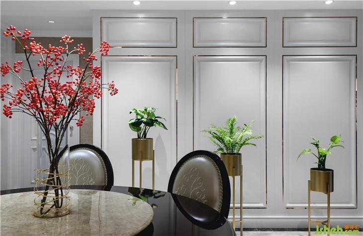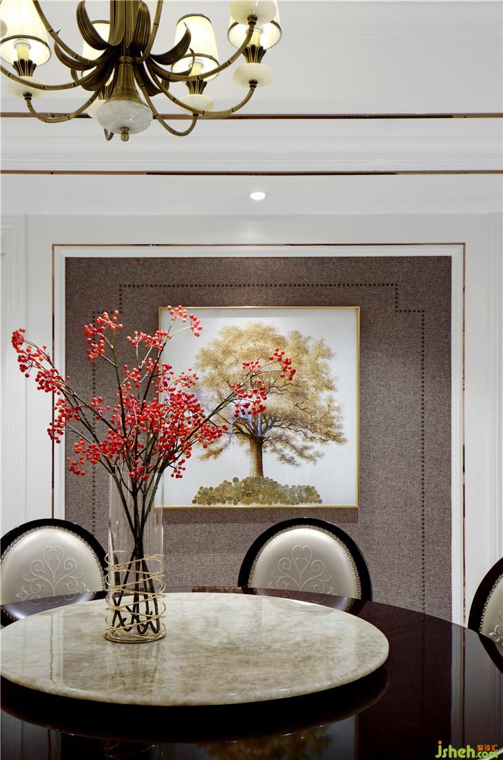 本案的業(yè)主尤為的喜歡白色及金屬色。白色代表著代表著純潔、端莊。金屬代表這尊貴。為了體現(xiàn)業(yè)主的高貴,運(yùn)用了金屬線條跟白色烤漆板的結(jié)合,使得整個(gè)空間多了一份高貴。客廳餐廳在同一個(gè)空間區(qū)域里,無須過多分割,石膏線條和黃銅裝飾取代了繁復(fù)的天花吊頂,勾勒出簡潔的美式風(fēng)格。而地板的拼花,則將客廳區(qū)域及餐廳區(qū)域做了個(gè)劃分。旁邊的酒柜體現(xiàn)了業(yè)主的生活方式。土黃色的軟磁是一種新型的材料,經(jīng)濟(jì)又環(huán)保,裝飾性強(qiáng),運(yùn)用于本案中,故有一番風(fēng)情,它的粗同烤漆護(hù)墻板的光滑形成了一個(gè)對比。黃銅的精彩應(yīng)用,盡情演繹了材質(zhì)和精湛工藝所承載的文化和創(chuàng)意,黃銅金屬掛件在沙發(fā)背后軟磁墻上更是把空間的美凸顯出來。值得一提的是餐廳的掛畫,是幅業(yè)主的手工藝品,不是藝術(shù)的搞藝術(shù),是由一枚枚的銅錢疊加起來的一棵曾天大樹。