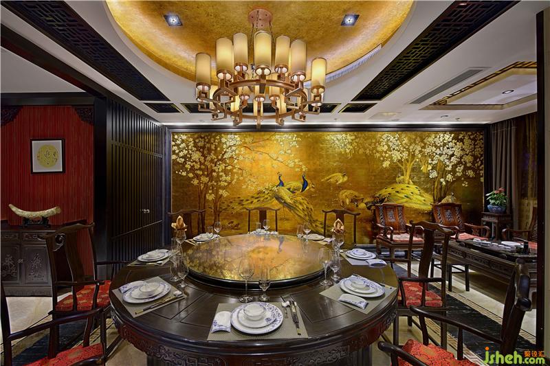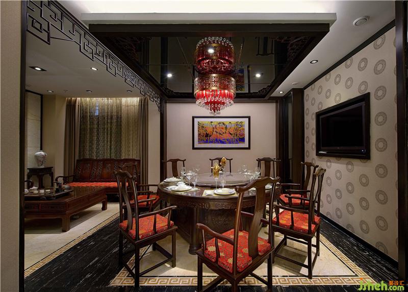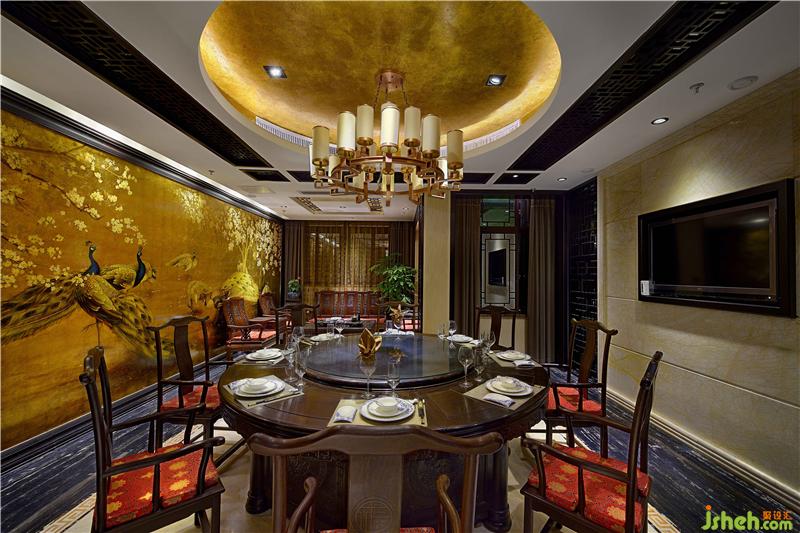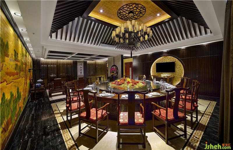 沿著黑色大理石樓梯緩步至二層,墻上實木窗格中裝飾的青花瓷盤創(chuàng)意獨到。它在深沉的色彩里投下一抹清明,一樓休閑平臺的山水畫卷屏風(fēng)被燈光映襯的靈動、高貴,既啟到了中式設(shè)計手法中的虛實結(jié)合,又充分提升了空間的藝術(shù)氣息。至于二樓大大小小的包廂各有特色,或雍容典雅,或清麗脫俗。中庭兩側(cè)包廂是設(shè)計師重點打造的部分,用窗欞面對中庭,讓在此包廂中用餐的尊貴客戶,能透過中式窗花的窗子,看見貫穿的一二樓中庭空間,別有一番意境。