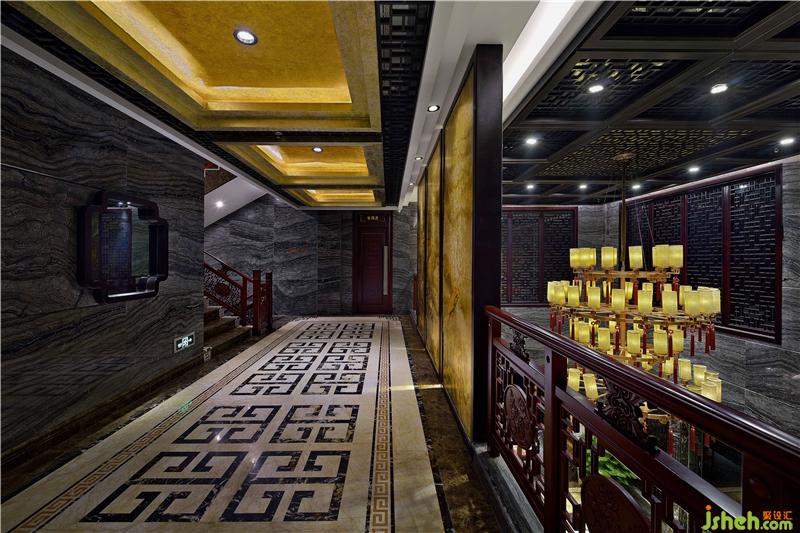 福臨門會所的大門被塑造成古時私家宅院的樣式,靜靜地坐落在繁華吵雜的都市中。門前高掛的大紅燈籠、朱黑的匾額、燙金的題詞,兩側(cè)石鼓豎立綠植郁郁蔥蔥,讓人不禁期待藏匿在門后的那個神秘的空間。推開厚重的鑲著如意銅扣的紅木大門,眼前不由一亮。一扇仿古雕花窗格木屏風(fēng)半遮視線,高達兩層樓的挑高有著天井一般的效果。這里懸掛的大型吊燈,凸顯大氣風(fēng)范。墻面、地板均使用天然石材裝飾,黑色、米白色、金沙色拼貼出的紋樣干凈沉穩(wěn),并孕育著空間不可或缺的氣度。