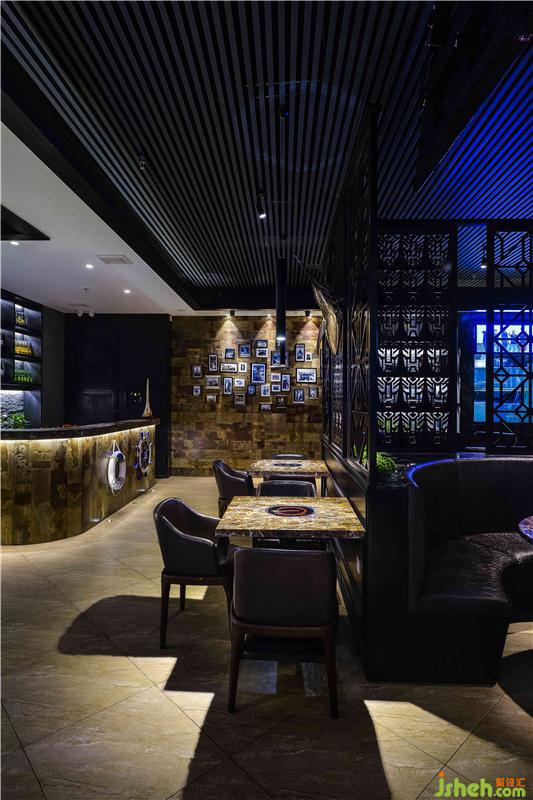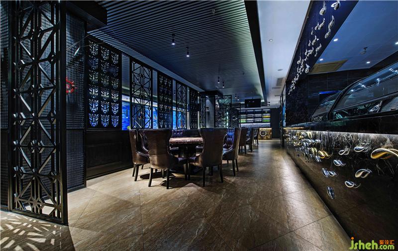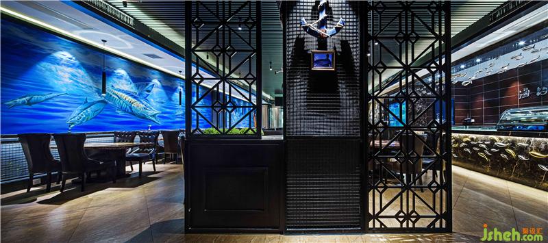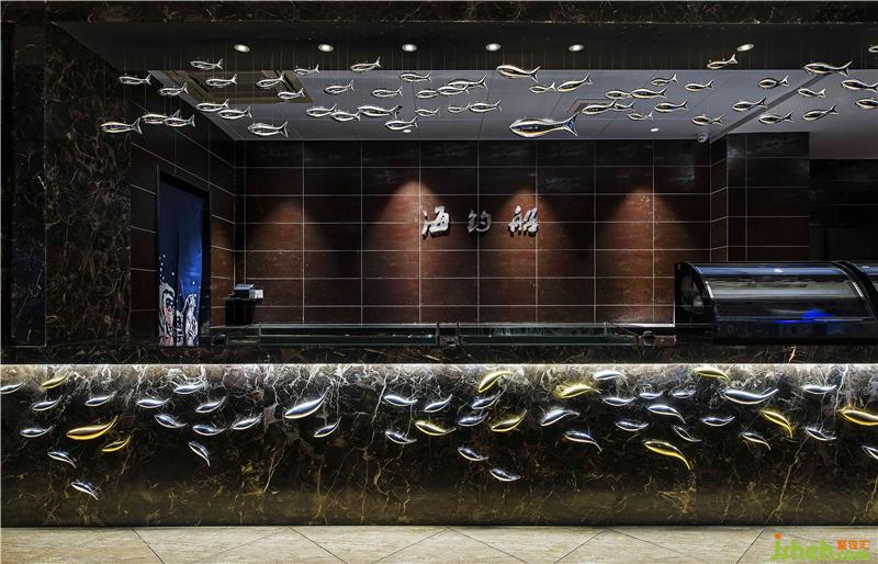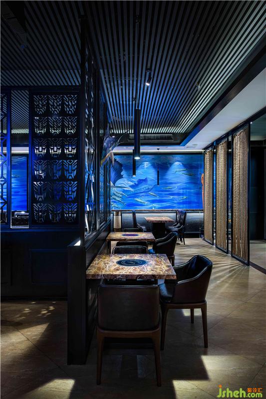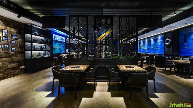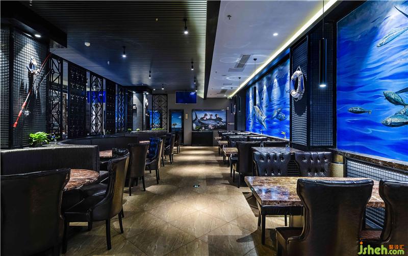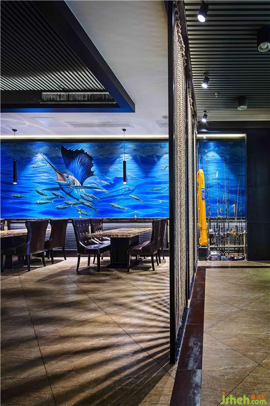 海釣船主題餐廳以“海洋”為主題,海洋藍(lán)色,寧靜、神秘、新奇帶給人像大海一樣不可測度的神秘感喝魅力,通過對原有環(huán)境的精心規(guī)劃,結(jié)合環(huán)境及周圍建筑的外觀,融入現(xiàn)代的設(shè)計手法和色彩搭配,使整體海釣船餐廳籠罩在一片優(yōu)雅的海洋中,遠(yuǎn)離城市的嘈雜和喧囂。海釣船餐廳大門運(yùn)用深灰瓷磚倒角斜拼,類似深海礁石營造一種即將進(jìn)入深邃的大海,去探索海洋的神秘的氛圍,讓顧客不由自主想要去探索。進(jìn)入大廳運(yùn)用麻繩、原木、救生圈、船舵等元素營造出身在甲板上的氛圍,墻面藍(lán)色色彩對比的3D噴繪,與整體較柔的燈光效果結(jié)合,加上店家實際出海捕魚的視頻播出,使顧客真實直面感受大海的親和力及活力,從而使顧客在這里享受放松,休憩身心回歸大自然的體驗。
