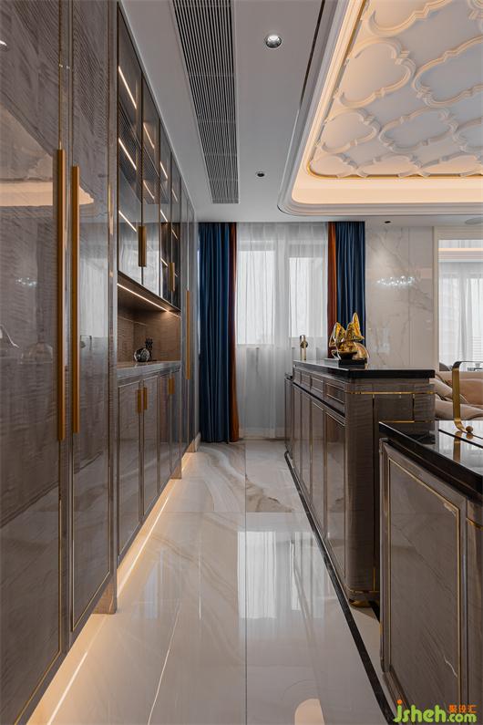客廳區(qū)域的背景墻以大板奢石瓷磚為主,左右兩邊采用暖白色調(diào)的護墻板鑲嵌金屬線條,大平層設(shè)計沙發(fā)背后的端景柜與裝飾柜采用灰影飾面做造型,天花造型搭配金屬水晶吊燈,整體大氣又不張揚,時尚家具點綴金屬線條與軟裝合理搭配,使得整個空間奢華感倍增。