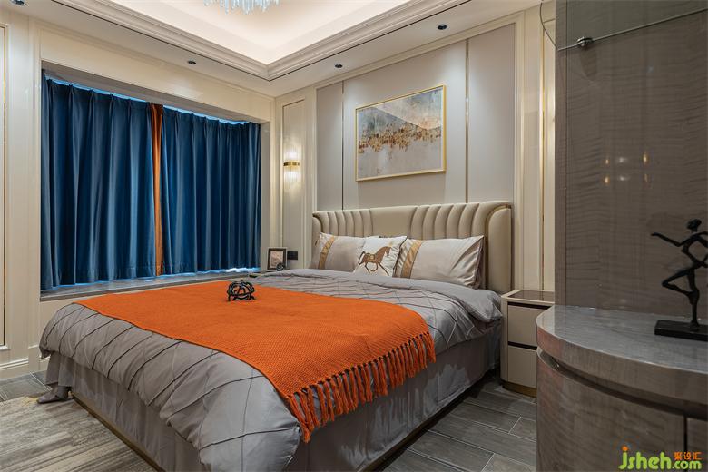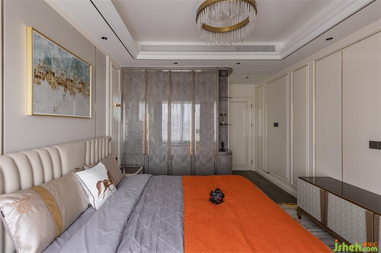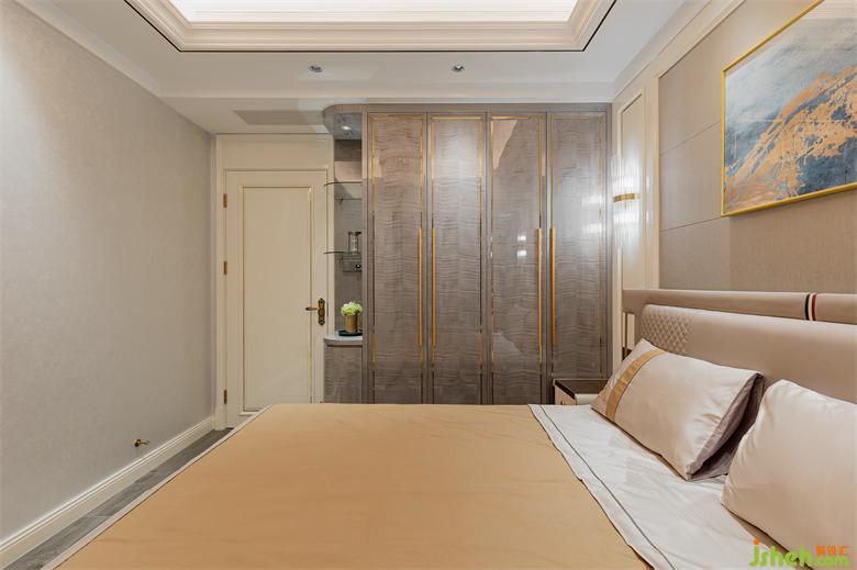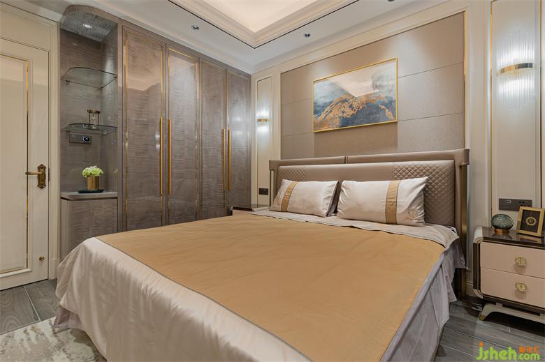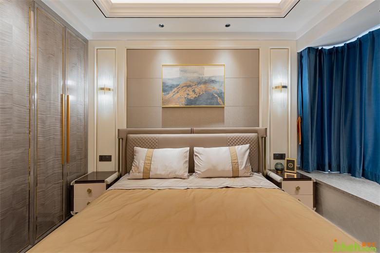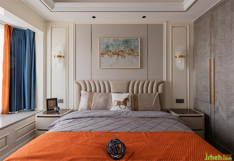 大平層設(shè)計主臥區(qū)域以暖白色護(hù)墻板為主,床鋪背景搭配素色硬包,藝術(shù)掛畫、水晶壁燈及床品的合理搭配,既營造出溫馨浪漫的休息空間,又使得整個主人房更加柔和、高貴、優(yōu)雅。