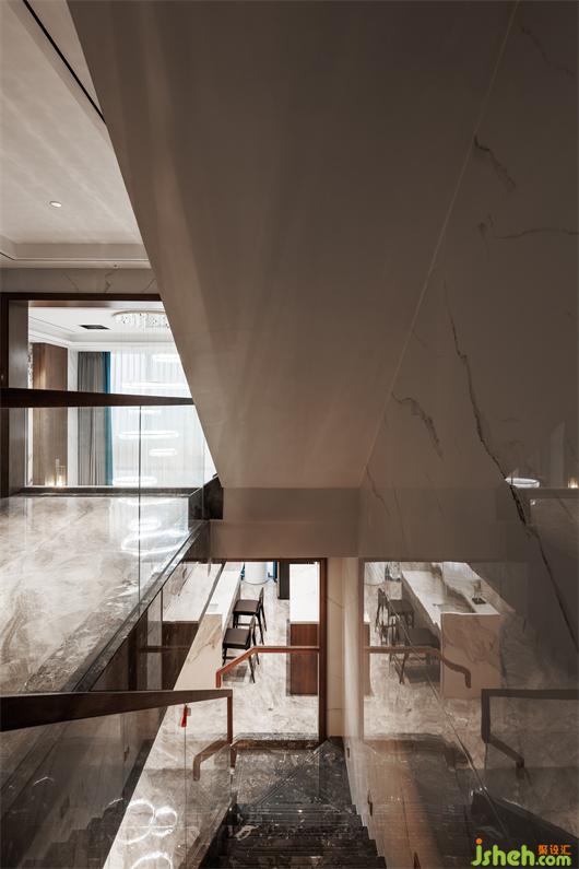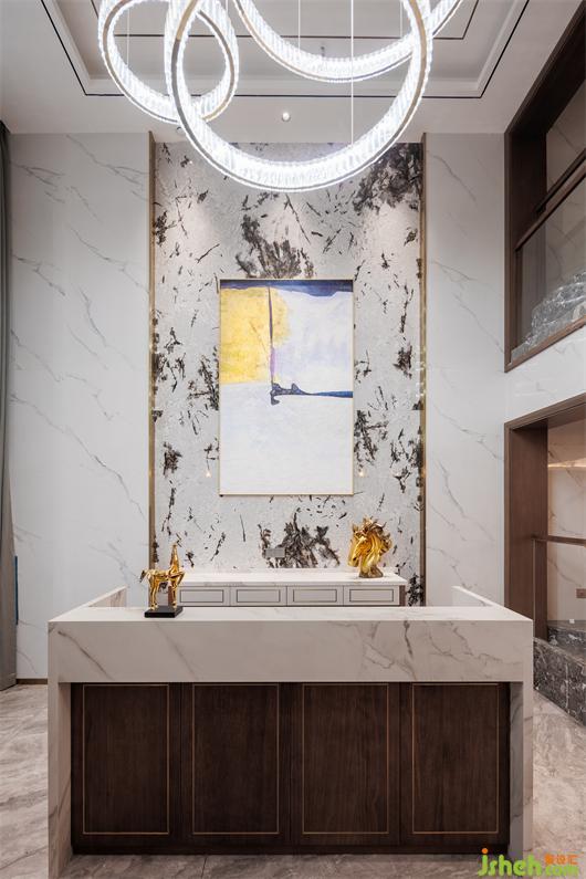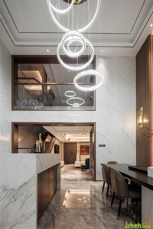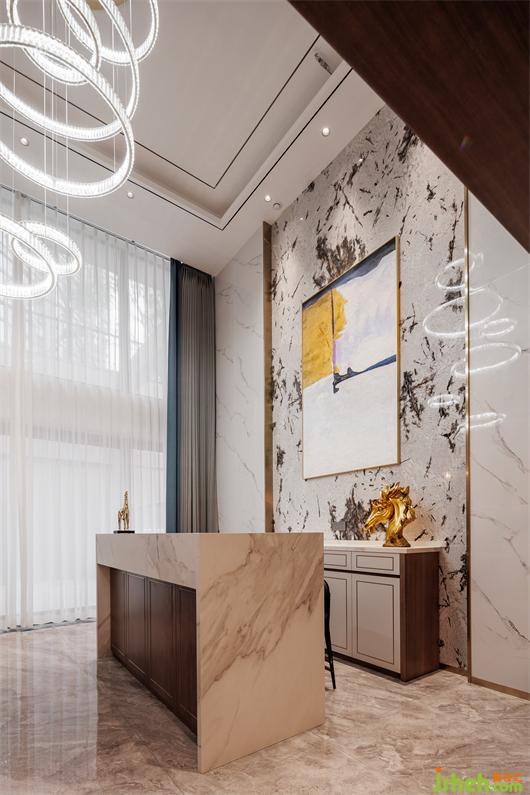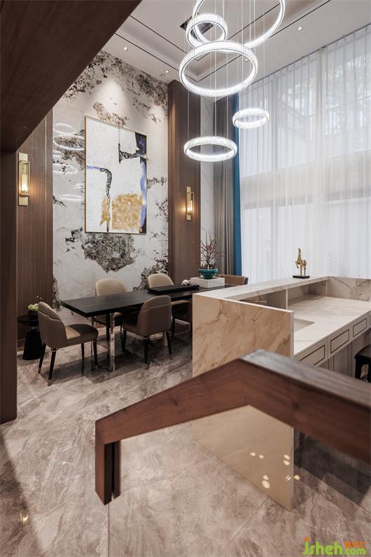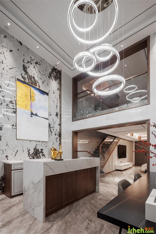 開放式餐廚空間,簡練線條托起華美肌理,別墅設(shè)計(jì)色調(diào)與材質(zhì)呈現(xiàn)珠聯(lián)璧合的疊加魅力,兼以藝術(shù)裝飾調(diào)味精致細(xì)節(jié)。