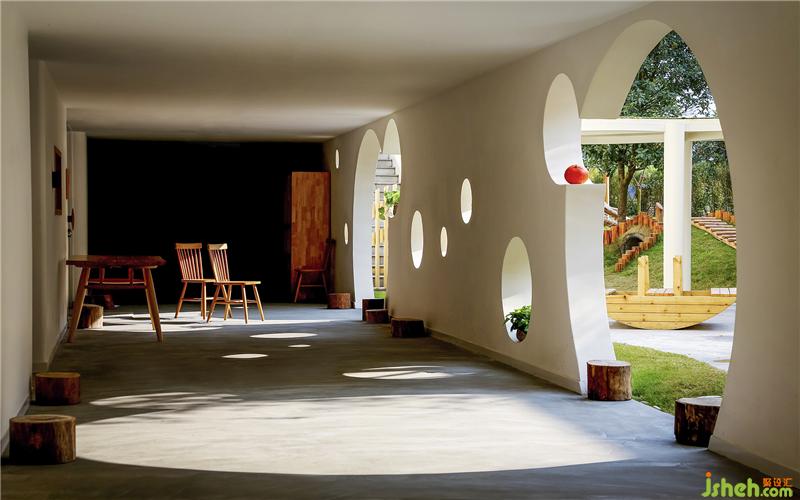 在改造前,光墨書(shū)院的走廊一直處于封閉狀態(tài),切斷了人們與季節(jié)的交流,CROX闊合用一個(gè)又一個(gè)的不同大小的圓將外墻打通,陽(yáng)光、風(fēng)雨、蟲(chóng)鳴——所有自然的美得以穿越空間,在孩子們自由奔跑的走廊上與他們交談,給他們啟發(fā)。隨著季節(jié)的變化,光影的位置、強(qiáng)度,戶外的風(fēng)景、溫度、聲音都各不相同,無(wú)論在書(shū)院的哪一個(gè)角落,孩子們都能體會(huì)到季節(jié)更迭,節(jié)氣變化,也對(duì)耕讀文化有了更深的理解。裝修公司