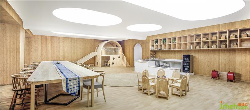The tables, chairs, beds, indoor lamps and other appliances of GuangMo are all specially designed for children. Wooden furniture enhances the affinity with the environment to the person , and chamfer and curved design , the application of indirect light , let the children release nature to the top of their bent while feeling the softness of nature.The configuration of circular arc also echoed loving school . The light membrane in the classroom are like a luminous cloud. When it shines , like there is daylight pouring down , children can bathe in the natural brilliance even in the room .