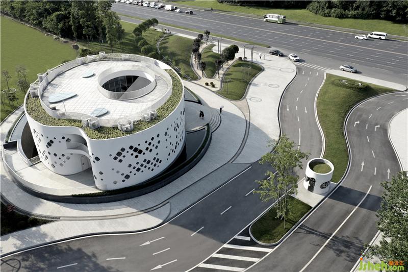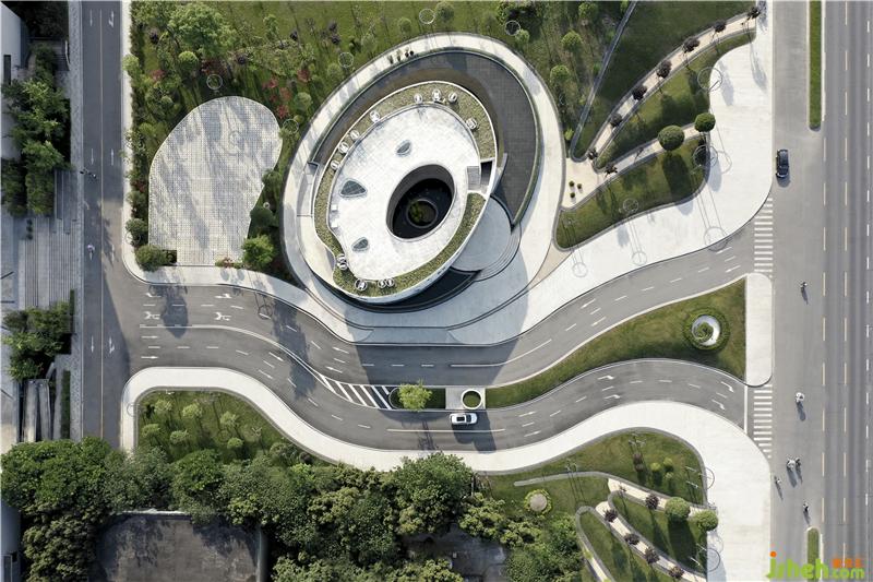 我們在位于成龍大道的主入口廣場上打造了層巒迭嶂的小山丘,如伸出的雙手般進(jìn)行流線配置,并通過地形的高低起伏,過濾面前道路的嘈雜紛擾。蜿蜒的車道設(shè)計(jì),緩和了車行速,轉(zhuǎn)換成輕松閑適的入園心情。規(guī)劃上以人車分流為主,停車場位于建筑人工地盤下;人行的動(dòng)線,則順著景觀流線,由大階梯延伸到園區(qū)內(nèi)。