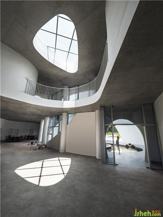文化中心以一種富有生命力的地景角度切入,純粹的橢圓體轉(zhuǎn)動構(gòu)成的動感漣漪紋理,為環(huán)形建筑的動線原型。借由圓圈的生成,構(gòu)成多層次的空間邏輯,達到一種互為表里的空間體驗。人們在此自由進出,由弧形的拱墻和精致的天窗, 感受通透和輕盈的品質(zhì)。環(huán)繞的空間將休閑、展覽、會議、接待、辦公、飲食等使用融合一體, 營造出親切友好的感受。外觀色彩賦予其水的氣質(zhì), 潔凈的白色墻體,更好的呈現(xiàn)出生動的光影。外部特殊設計的平推窗,具有調(diào)節(jié)光線和溫度的功能。由混凝土構(gòu)成的原始空間結(jié)構(gòu),在大面的落地窗分割下,模糊了中庭的界線。上方的天窗與外側(cè)透進的水滴光點, 形成的曲線與孔洞,自然又親切。建筑中在屋頂綠化上考慮到綠能環(huán)保,采用自然館內(nèi)溫度的調(diào)節(jié)方式,回收雨水,做造景水池。小白樓一方面與其所在的歷史背景建立了對話,另一方面也作為企業(yè)孵化園公共性的建筑,吸引著人們來探訪。自然的力量構(gòu)筑成建筑主體, 最終形成一個強有力的符號,與眾人分享。
