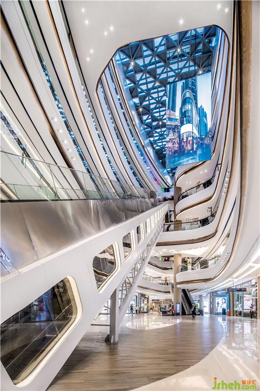 空間整體狹長有余、空曠不足,如何營造整體的流暢感,并在這個基礎(chǔ)上形成高效的人流動線,提高空間的使用率,成為設(shè)計要解決的首要問題。在商場的主中庭,LB凌奔設(shè)計架起一座從一樓直通五樓的“飛天梯”,達到了最高效的人流輸送。這對于一個規(guī)模100000㎡的商業(yè)綜合體意義重大,意味著最大客流接待能力10%的提升。