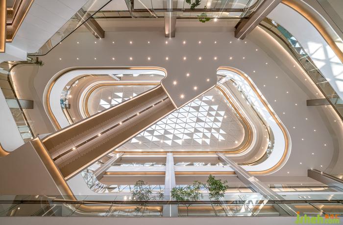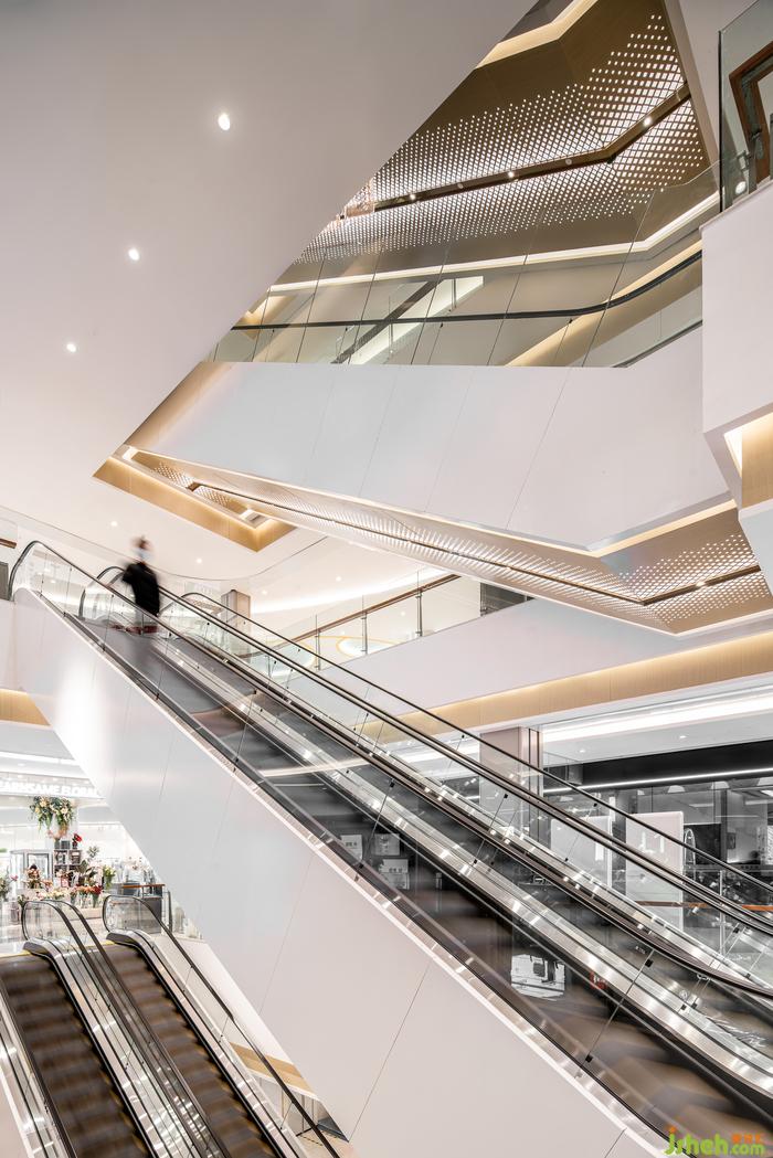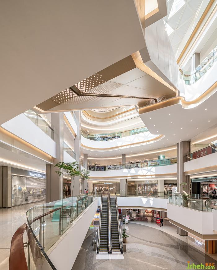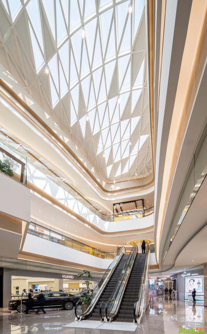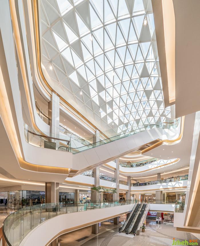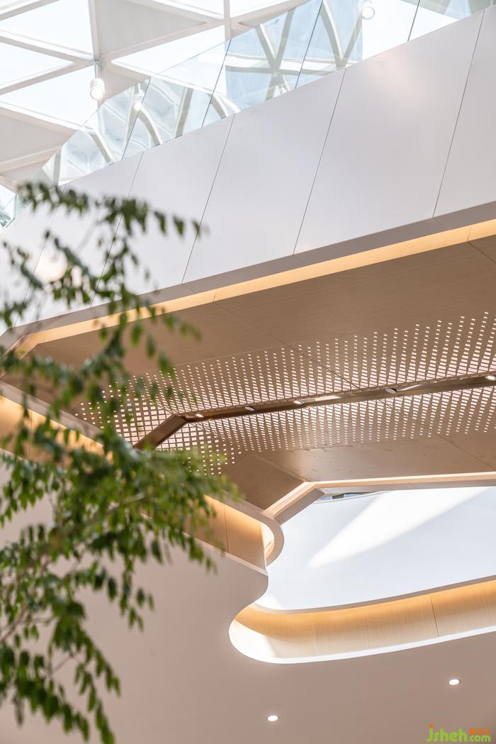 中庭天花采用藝術(shù)鏤空鋁板,購物中心設(shè)計以幾何圖形拼接而成,帶來結(jié)構(gòu)的美感;陽光照耀在散漫分布的綠樹上,煥發(fā)出勃勃生機;光影隨著時間起舞,喜悅油然而生。