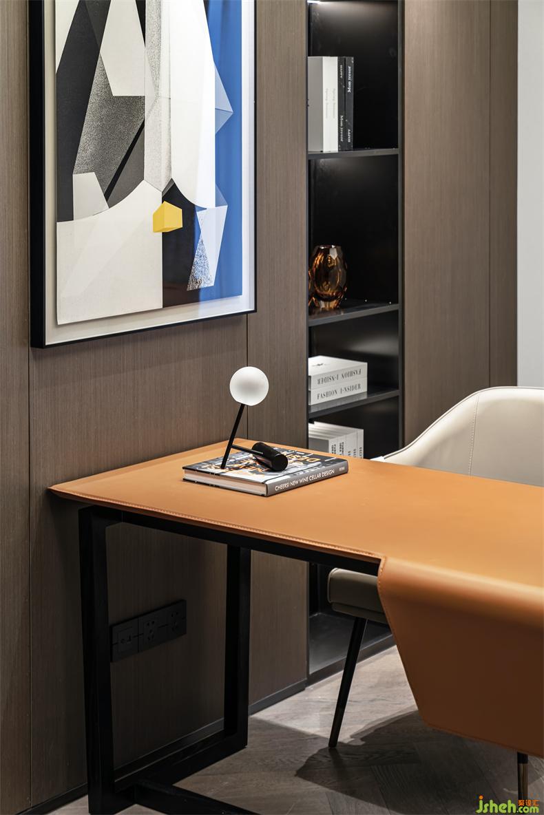 懸挑書桌前的柜體墻面比例,與抽象派畫作的天馬行空形成序列感。