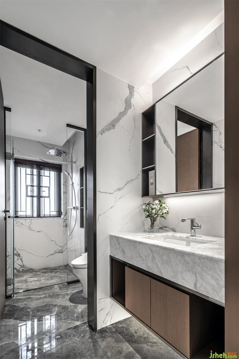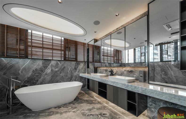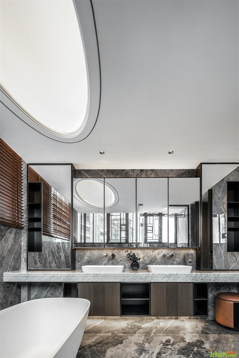 主衛(wèi)大塊面的玻璃間隔,令空間產(chǎn)生視覺上的想象和延展。一輪橢月與地面對應(yīng),象征季節(jié)輪轉(zhuǎn)與人間圓缺,地面大理石的肌理,大氣寬敞的雙臺盆與墻出水龍頭設(shè)計(jì),處處都在體現(xiàn)著男女主人尊貴的地位身份。