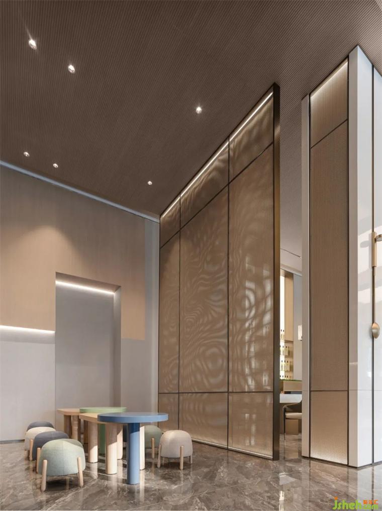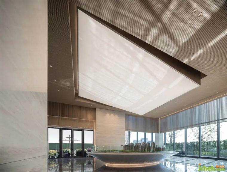 洽談區(qū)以軟燈膜模擬自然天光,裝修設計模糊室內外的邊界,讓自然的生命力量傾瀉其間。影與之相隨,穿過格柵的陣列,即興創(chuàng)作大自然的藝術,隨時間而流轉的光影,讓空間松弛輕盈。