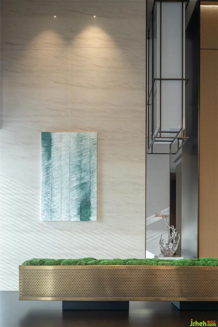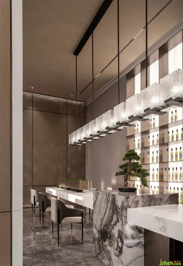 設計師以柱為陣,統(tǒng)合墻面與天花,利用線條、肌理、色彩和飾物,巧妙地創(chuàng)造出整體空間的秩序,產生絕對理性與秩序的尊崇氣度。