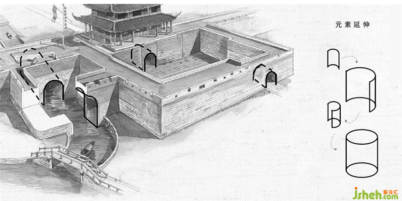 提取了園林中的月亮門及拱橋的弧形
