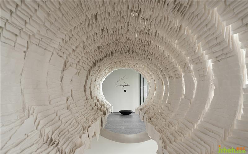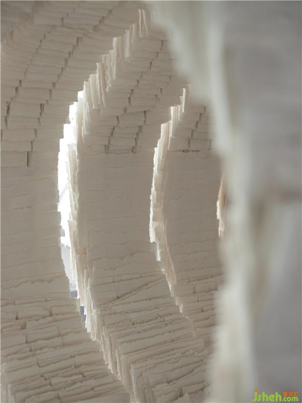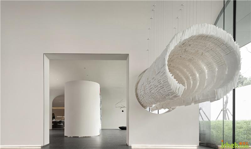 步入內(nèi)部,紙質(zhì)的巨型長筒裝置穿插于空間中,視覺也隨著裝置透過墻壁穿梭,呈現(xiàn)出空間的豐富性和新穎性,凸顯了美術(shù)館般高雅的藝術(shù)氛圍。優(yōu)美靈動的弧線造型在空間中不同的肆意綻放,移步換景,咫尺之內(nèi)再造乾坤,伴著步伐穿梭旋轉(zhuǎn)盡情享受視覺上的新奇的體驗(yàn)。