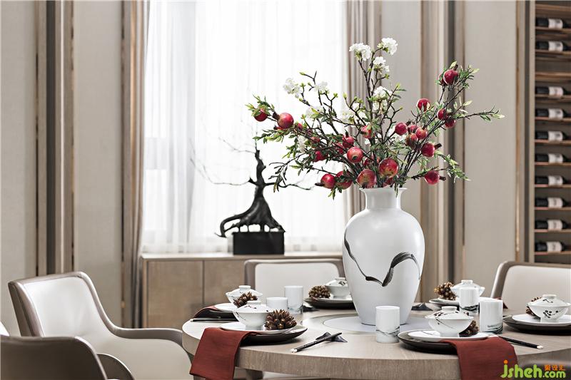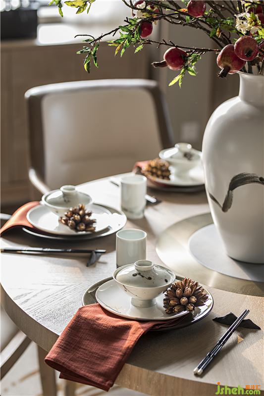 餐廳處放置小巧的新式木質(zhì)圓桌,中式餐具,大膽采用火紅的石榴裝飾,舒適的靠背椅,亦中亦西,融匯在此人間煙火之地。