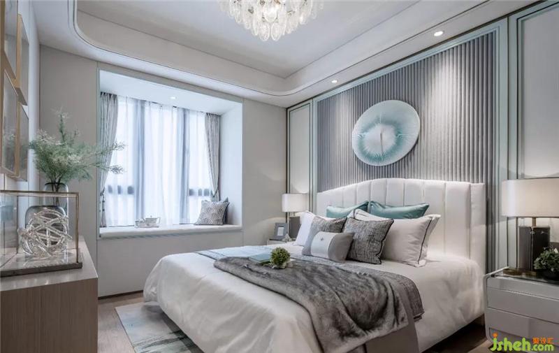 臥室是人們心所歸處。主臥利用步入式衣帽及展示柜。開放式主臥衛(wèi)生間、衣帽間、女主人的化妝臺交叉功能,樣板房設計面積配比不再是局限。蒂芙尼藍柔和的色彩提升幸福感和歸屬感。時尚與美學在其中跳躍,驚起一絲慵懶與愜意的波瀾,又平添一份驚鴻一瞥的包容。