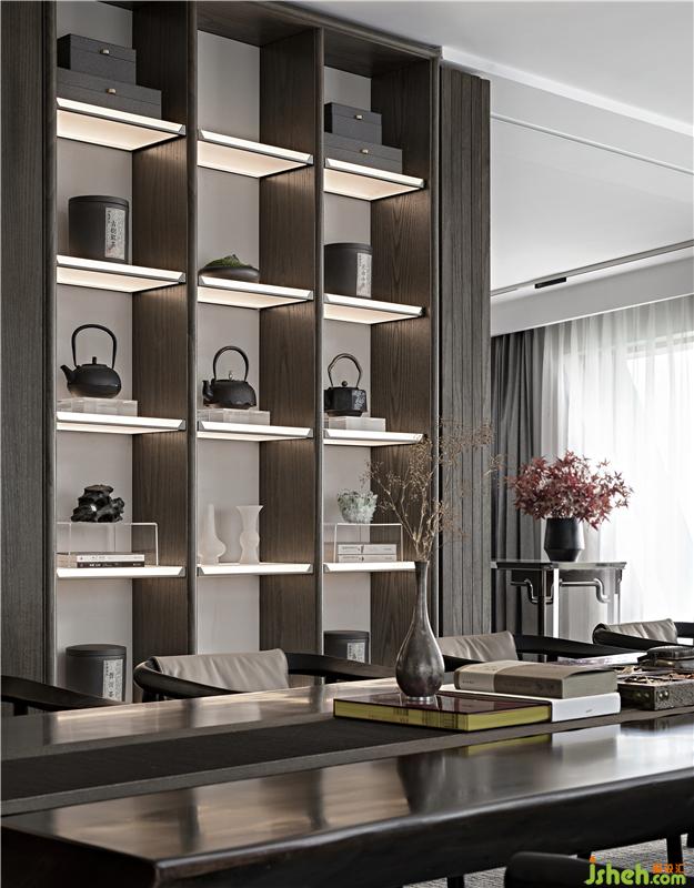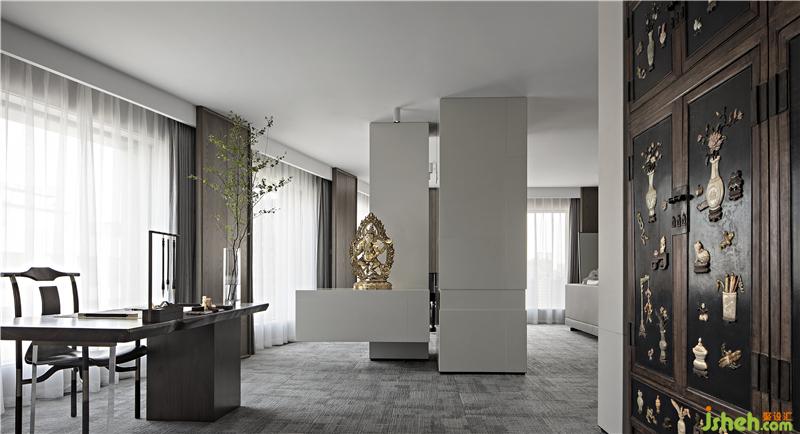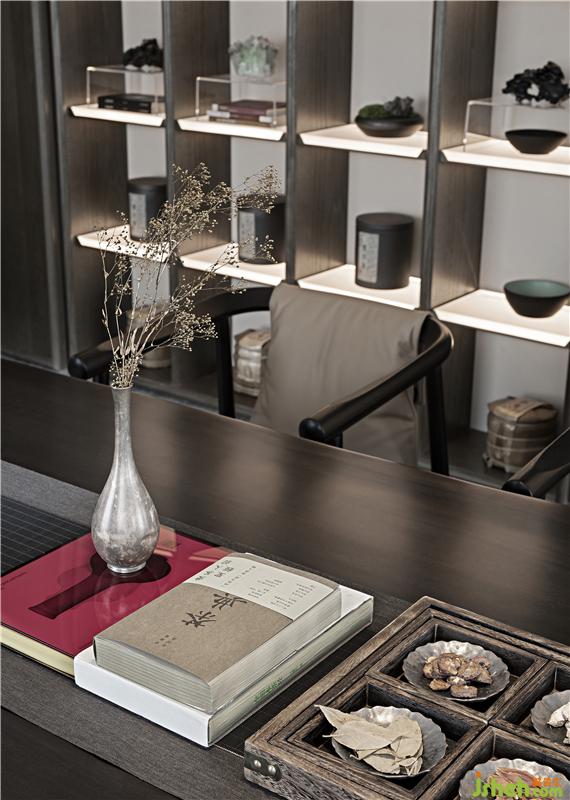 客廳一隅,是中式書房,文房四寶、浮雕立柜,深色原木紋裝飾,會所設計簡單不失雅致,厚重不失冷靜,端的是鬧中取靜,修身養(yǎng)性。