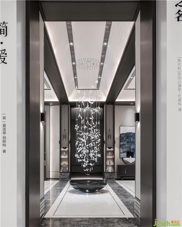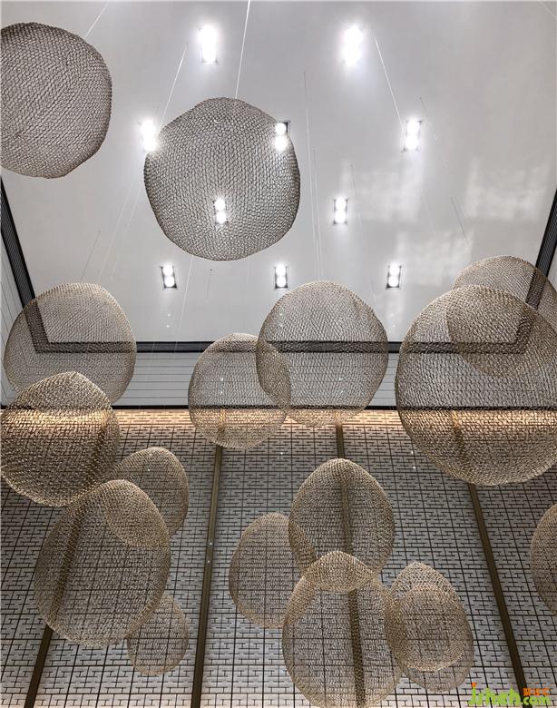 銅色不規(guī)則金屬球懸于半空,半透明的立體感打破中式的對(duì)稱的厚重感。整個(gè)畫面層次分明,方圓有道,上下隔斷的方式使得極高的挑高不至于空洞,采用金屬質(zhì)感的中式窗欞圖案,華麗卻不失典雅。
