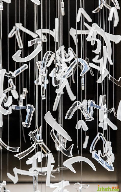 售樓處設(shè)計(jì)以書的厚薄高低無(wú)序排開,堆砌成墻體,有中式的無(wú)聲《吶喊》,也有西式的“靜默如迷”,紙張紛飛,筆劃垂如絲絳。就像把書桌放大100倍,人如螻蟻,一道窄門開啟學(xué)海無(wú)涯的人生。
