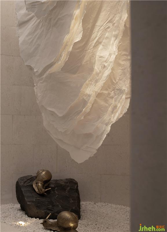 船型大理石打造的意境空間,仿佛是空間的衍生。像是走進(jìn)了水墨山水畫,是當(dāng)代氣韻的內(nèi)外映射?!核妓?nbsp;· 探知』裝置位于其間,映應(yīng)了山水人文的關(guān)系,詩詞古畫的傳承。