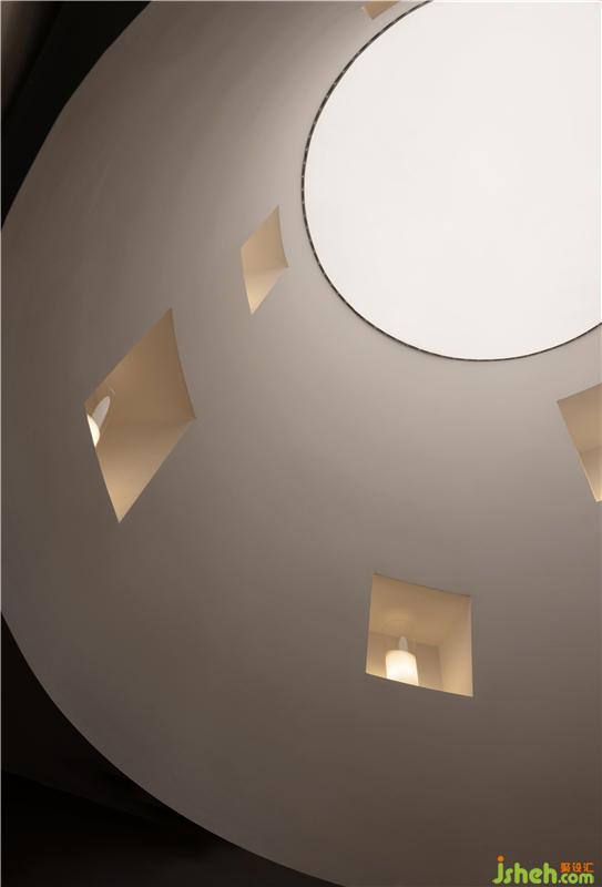 在方舟內(nèi)引入一個(gè)巨大光環(huán)裝置。天光與燈光貫穿使得空間光影霎時(shí)變幻不定。天頂和圓燈的寬闊嵌套,將這個(gè)空間營造得猶如連接外界的垂直管道。