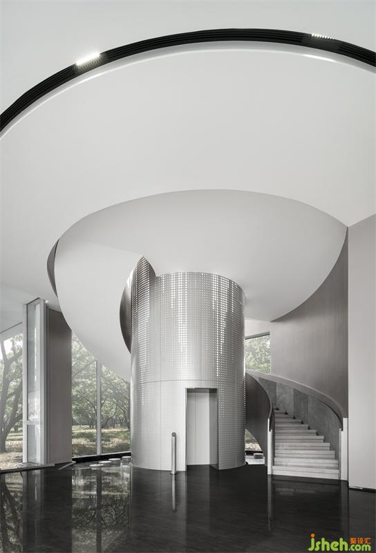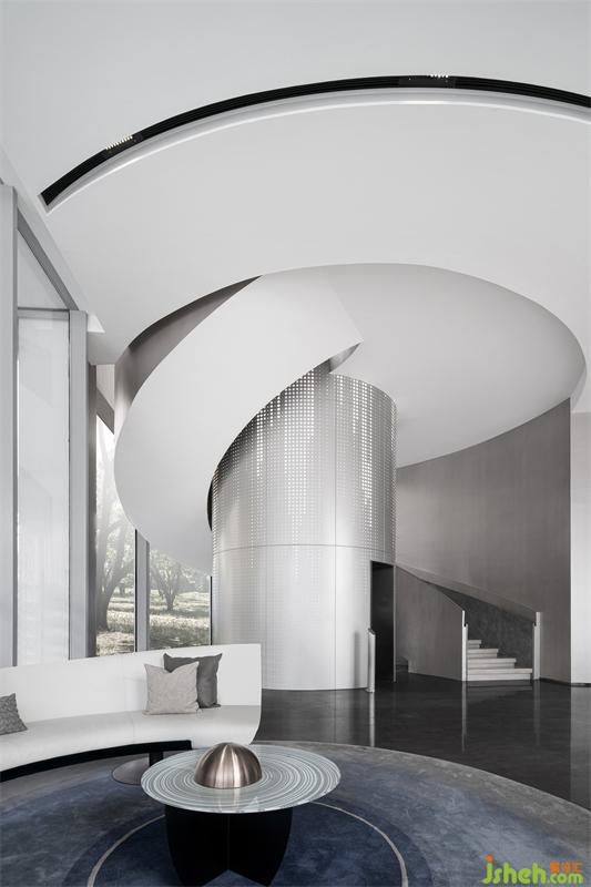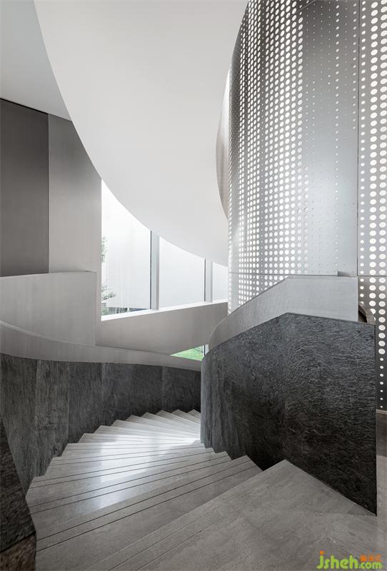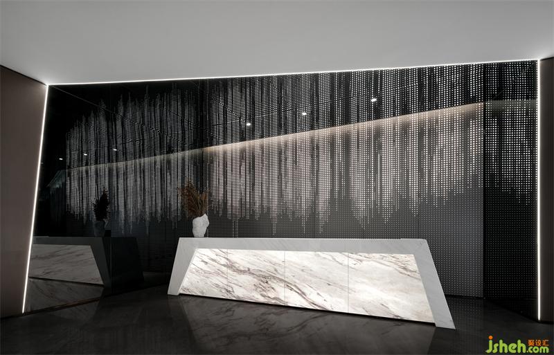 瀑布圖案+沖孔鋁板可視化呈現(xiàn),像星河傾瀉,從前廳旋轉(zhuǎn)樓梯的表面更新形成信息流,盤旋向上傳遞到二層前廳,充滿流動的前衛(wèi)科技感。