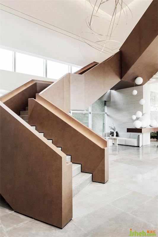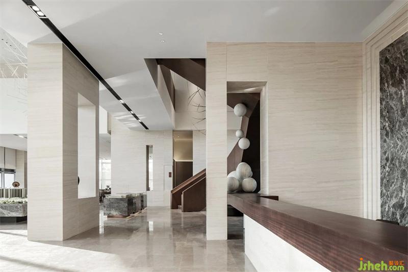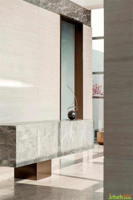 承接硬裝純粹、理性的美學(xué)風(fēng)格,對多元的線條、色彩的升華,表達強烈韻味的活力與激情。前廳接待臺面則是透過門洞的幾何體浮在光影的體積中,配以線條感栩栩靈動的藝術(shù)品點綴。
