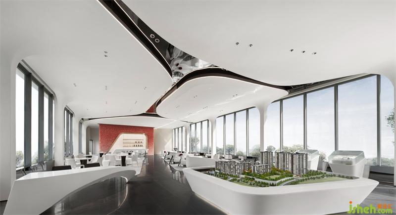 空間在尺度上并不具備優(yōu)勢的狹長空間中,營銷中心設(shè)計師在滿足售樓處功能的同時,通過縱向挑空,橫向拉伸的設(shè)計原則,為空間打造盡可能的開敞布局,使整體空間與建筑、戶外景觀融為一體,減少局促感、壓迫感。